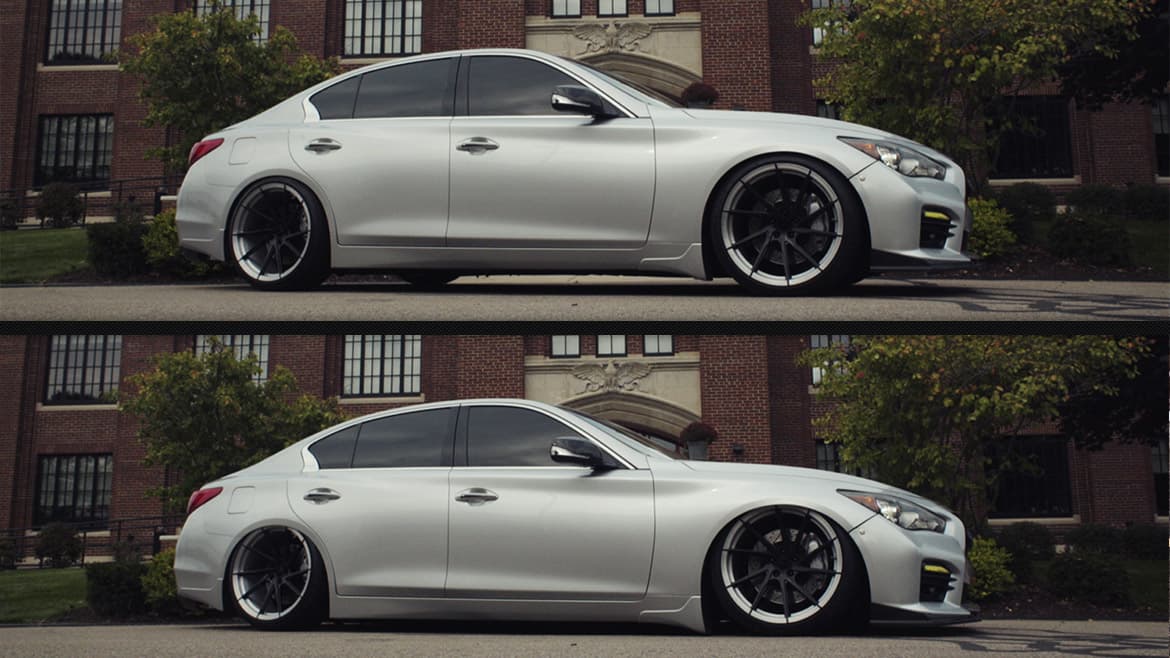 With this in mind, Air Lift Performance is extremely excited to launch a new threaded-body suspension system specifically designed for the RWD Infiniti Q50 (2014+). Each strut is a direct replacement for the OEM suspension and gives you complete control of your suspension. At the push of a button, you can drop your Infiniti Q50 3.3 inches on the front axle and 3 inches on the rear, even while on the move! There’s no need to worry about steep driveways, speedbumps, or in-road obstacles with Air Lift Performance. You can adjust your ride height without even leaving your seat, eliminating all those classic lowered-car problems!