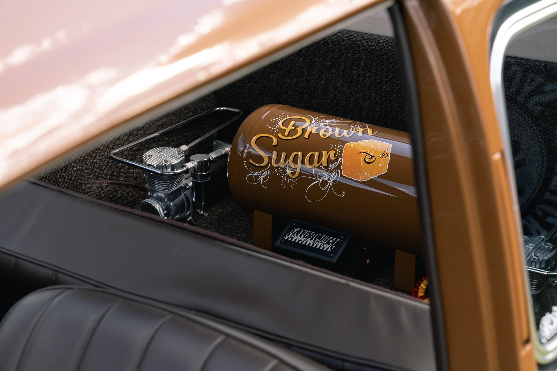 Air Lift Performance’s 3P air management system brings this ’50s Bug into the 21st century with iPhone app control. The pin-striping on the tank is a cool touch and can be seen through the distinctive oval rear window.